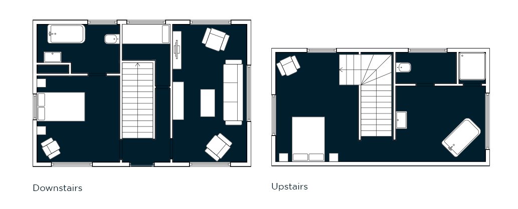 Sleeping five in 2 double ensuite rooms and an additional bedroom nook (suitable for one child), The sitting room has a log burner, games cupboard, record player and TV. On the landing, you’ll find a fridge and a nespresso machine.